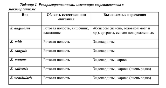 Инфекционный эндокардит – это бактериальное поражение клапанов сердца, эндокарда или эндотелия, прилегающего к сердечным или сосудистым образованиям. В механизме развития данной патологии играют роль дефекты сердца, создающие платформу для развития этого угрожающего жизни заболевания. При попадании таких микроорганизмов как Streptococcus viridans в системный кровоток человека они могут колонизироваться в области эндокардиальных дефектов и привести к развитию инфекционного эндокардита. Необходимо сказать несколько слов о зеленящем стрептококке. Конечно, не он единственный является возбудителем ИЭ, но его роль неоспорима, особенно при стоматологических вмешательствах. В таблице 1 достаточно четко отражена роль зеленящих стрептококков.